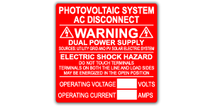 PHOTOVOLTAIC SYSTEM AC DISCONNECT. WARNING DUAL POWER SUPPLY. SOURCES UTILITY GRID AND PV SOLAR ELECTRIC SYSTEM. ELECTRIC SHOCK HAZARD. DO NOT TOUCH TERMINALS. TERMINALS ON BOTH THE LINE AND LOAD SIDES MAY BE ENERGIZED IN THE OPEN POSITION. OPERATING VOLTAGE (FILL IN VOLTS). OPERATING CURRENT (FILL IN AMPS).